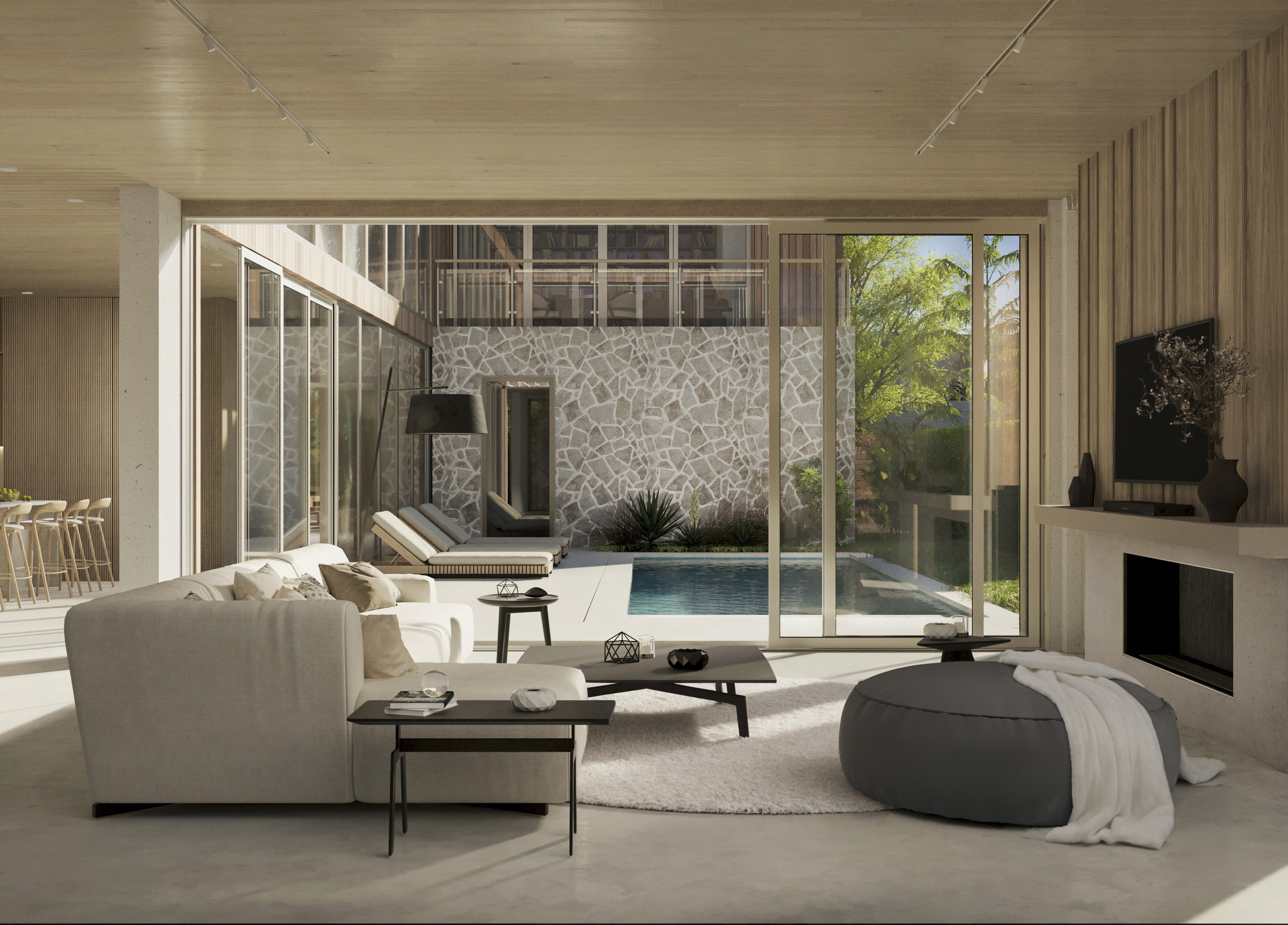 Timberline draws from Scandinavian modern influence, expressed through simple gabled forms, exposed timber, and a restrained material palette. The house is organized around a central courtyard that anchors light, circulation, and daily use.